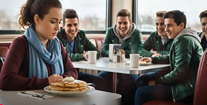 À la table voisine, un groupe d’adolescents riait bruyamment, d’un rire sec et cruel. 😱 L’une d’elles donna un coup dans l’assiette de Lidia — les pancakes tombèrent au sol, éclaboussant le sol de sirop. Une autre fit violemment bouger le fauteuil, faisant sursauter la jeune fille.