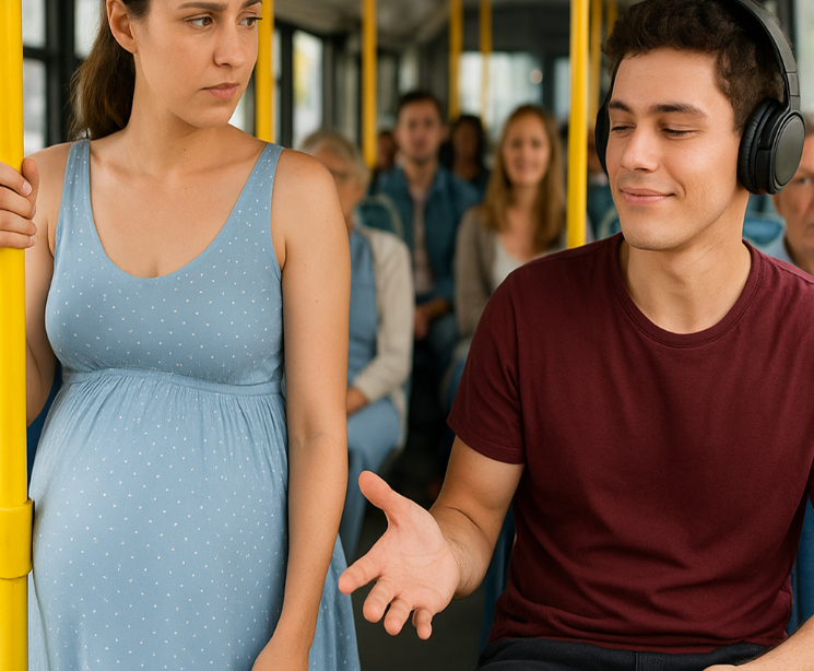 Le bus avançait péniblement dans une rue étroite, chaque siège occupé, chaque guidon serré. L’air à l’intérieur était lourd, chargé de chaleur, de murmures et du léger grincement des freins. À l’arrêt suivant, une jeune femme monta à bord. Elle portait une simple robe d’été et avançait prudemment, les mains posées délicatement sur son ventre arrondi. Enceinte de sept mois, elle se tenait avec une dignité tranquille, mais la tension sur son visage trahissait la difficulté de rester debout.